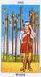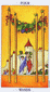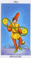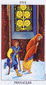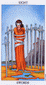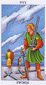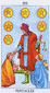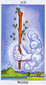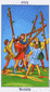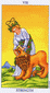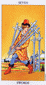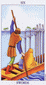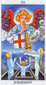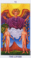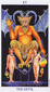 The phoenix heads turn away as if they wish to avoid each other. The card is general description of a state in which the creative energy and power of Leo are blocked (Saturn). The free-flowing energy has been greatly hemmed in a constricted. This pent-up energy is uselessly seeking an opportunity for expression. Life becomes a burden. The little wings underneath are still trying to lift the heavy lead wand.