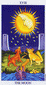 The sun shines at the centre of the twelve zodiac signs and bathes them with its light. The rose of knowledge blossoms from its innermost core. Its light is the essence of clarity and ultimate awareness. Two children with butterfly wings are dancing on the green mountain of creativity, expression of the librated partnership between man and woman. The wings of creativity, the unifying experience in dedication to the light will raise them up. They are absorbed by the all-transforming light; every moment is replete with the experience and enjoyment of total fulfillment. They are not striving for a distant goal. Everything is here and it is good. A profound alchemistic process of transformation takes place in experiencing the throes of ecstatic sensation. As the individual was a reflector of light on the "Moon" tarot card, he has now become the source of light itself. Just as the warmth of the sun produces a chemical reaction in the ripening process of fruit, so does something new and altered mature in the nature of man.