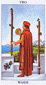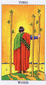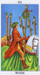 The central sword of clarity is confined by tow smaller swords which are bent and therefore out of harmony. The rose is damaged and is losing its petals. Clarity has disappeared. Dark clouds (doubt, anxieties, worries) limit the expanse of spirit. Saturn, the strict teacher, elucidates all impurities and rules out all excuses. The lesson to be learned here is nothing less than that of mastering negative thought. Brooding and skeptical expectations must clearly be recognized as forces which separate us from our own originality. This card may also refer to three-way relationships that are changed with tension.