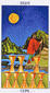 This card is a general indication of a journey or a new phase of life (relationship, residence, job). No decisions should be made in haste. Everything must be carefully tested and prepared. But once all the consequences have been considered thoroughly, the departure should not be delayed unnecessarily. Everything points to a pleasant development. With every new beginning, we leave the boring routine of everyday life behind us. Spiritual inspiration and ideas multiply and expand our field of activity (concentric blue circles in the back-ground). We are now in a position to take on and accomplish several activities at once. The diversity of the tasks is exciting and enriching. Despite great activity, we remain true to our highest ideals. The road on which the chariot stands is paved with gold.