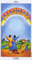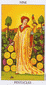 The tips of all four equally strong swords are centered in the middle of the open rose blossom. Worries have been mastered. The clarity of the Ace of Swords has been regained; blue shines through once more. Yellow-green, the color of spiritual creativity, once again dominates the picture. In this atmosphere, the rose of knowledge may unfold and bloom. The qualities of happiness and expansion are inherent in Jupiter. What appeared to be futile now has the necessary for a happy and profitable solution. However, there is also a warning here: truce does not mean peace.