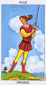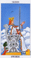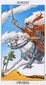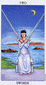 The prerequisite for inspired thought processes is unlimited freedom; creative thought accepts no boundaries. That is why the Prince raises his sword high to server the ties with the three figures pulling the chariot. These three represents restrictive ideas or emotions, or even confining relationships that could hinder the movement of the chariot. The crystal in the chariot has the shape of a double pyramid and shows the crystallizing of perception. The time is right to lend form and shape to new ideas.