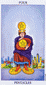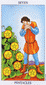 The "Prince of Disks" represents the proves of blooming and pollination which is indicated by the myriad flowers in the background. He is astride a very strong chariot pulled by a powerful bull. The symbol of the bull is also on the Prince's helmet. The fruit depict the richness of the harvest which will follow fertilization. In his left hand he holds a sphere with mathematical symbols; it looks like a globe. This refers to the manifestations (fruits) which never cease renewing themselves on micro- and macrocosmic levels. The scepter in his right hand symbolizes global awareness which manifests itself in each and every earthly phenomenon. With an unerring will, the bull pulls the chariot forward. Nothing can stop him, nothing can break his will of steel to reach his goal.