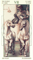 This card shows the marriage of the Empress and Emperor. The ceremony is conducted by the Hermit, a form of the god Mercury. He is completely hidden by his garments. This is an indication that the original source of all things is beyond what is seen and comprehended. The Lovers are an expression of opposites that yearn for and are attracted to each other. The duality reflected in every aspect of existence is experienced existentially in the love relationship between man and woman. Every attempt at reconciliation, union, or contact is an expression of the passionate urge to restore lost unity. Those things that make another person irresistible are aspects of ourselves with which we want to become one. They force themselves into our conscious mind, demanding to developed.