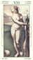 To understand this card, you must free yourself of all traditional, moral and superstitious ideas. The Devil is represented by the god Pan in the form of a white mountain goat with powerful, curving horns. The column behind it symbolizes the erect male penis, two balls are the testicles. It depicts creative energy in its most material and masculine manifestation. The merging of earthly and cosmic insight inspires man and renders him able to creatively shape the new. An open third eye can be seen on Pan's forehead. Indicating his powers of enhanced, extrasensory perception. He is a seer who not only perceives what is visible on the surface, but has the power to penetrate deeply into the nature of things.