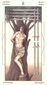The Hanged man is nailed upside down. A position that completely breaks with every type of self-will. It is a no-win situation. There is no room for action or manoeuvring. There is no escape. The serpents of the transformation and wisdom are coiled and sleeping. The Hanged Man is nailed to the wood of his rigid attitude and outlook. His eyes are closed meaning he is blind to everything that deviates in any way from the closed system of his own ideas. Any thought of a different kind, every new impulse is ignored or resisted. The Hanged Man's head is shaved. The hair, symbolizing antennas of spiritual perception, has been removed; the Hanged Man has lost his faith in his own intuition. Every effort appears hopeless and doomed to failure. Ye in this hopelessness miracles do happen! This type of capitulation, the abandonment of unyielding self-will and inflexible ideologies goes hand in hand with far-reaching change: the breakdown of rigid patterns of behavior, the clearance of rubbish; complete submission to higher self, freed from narrow mindedness and dogmatic, know-all attitudes.