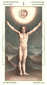 The sun shines at the centre of the twelve zodiac signs and bathes them with its light. The rose of knowledge blossoms from its innermost core. Its light is the essence of clarity and ultimate awareness. Two children with butterfly wings are dancing on the green mountain of creativity, expression of the librated partnership between man and woman. The wings of creativity, the unifying experience in dedication to the light will raise them up. They are absorbed by the all-transforming light; every moment is replete with the experience and enjoyment of total fulfillment. They are not striving for a distant goal. Everything is here and it is good. A profound alchemistic process of transformation takes place in experiencing the throes of ecstatic sensation. As the individual was a reflector of light on the "Moon" tarot card, he has now become the source of light itself. Just as the warmth of the sun produces a chemical reaction in the ripening process of fruit, so does something new and altered mature in the nature of man.