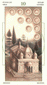 The "Prince of Disks" represents the proves of blooming and pollination which is indicated by the myriad flowers in the background. He is astride a very strong chariot pulled by a powerful bull. The symbol of the bull is also on the Prince's helmet. The fruit depict the richness of the harvest which will follow fertilization. In his left hand he holds a sphere with mathematical symbols; it looks like a globe. This refers to the manifestations (fruits) which never cease renewing themselves on micro- and macrocosmic levels. The scepter in his right hand symbolizes global awareness which manifests itself in each and every earthly phenomenon. With an unerring will, the bull pulls the chariot forward. Nothing can stop him, nothing can break his will of steel to reach his goal.