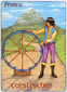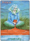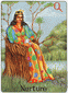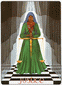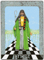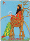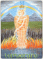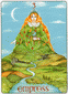 The "Queen of Disks" has completed her arduous journey through the desert (background) and has arrived in a green and fertile land. She reposes ion a very large pineapple enjoying the refreshing countryside, and has time to look back over the long, difficult path. The crystal wand and the curved horns on her head signify the clarity of her enhanced perception. Her robe of snakeskin and the orb in her harms symbolize the Earth's revival and are sign of fertility. The billy goat in front of her represents the power of conception, virility, the origin of new life. This figure can also represent the characteristics of Capricorn; tough, tenacious, independent.