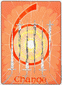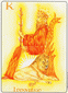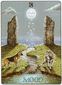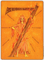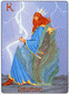 The phoenix heads turn away as if they wish to avoid each other. The card is general description of a state in which the creative energy and power of Leo are blocked (Saturn). The free-flowing energy has been greatly hemmed in a constricted. This pent-up energy is uselessly seeking an opportunity for expression. Life becomes a burden. The little wings underneath are still trying to lift the heavy lead wand.