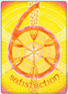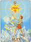 The sun shines at the centre of the twelve zodiac signs and bathes them with its light. The rose of knowledge blossoms from its innermost core. Its light is the essence of clarity and ultimate awareness. Two children with butterfly wings are dancing on the green mountain of creativity, expression of the librated partnership between man and woman. The wings of creativity, the unifying experience in dedication to the light will raise them up. They are absorbed by the all-transforming light; every moment is replete with the experience and enjoyment of total fulfillment. They are not striving for a distant goal. Everything is here and it is good. A profound alchemistic process of transformation takes place in experiencing the throes of ecstatic sensation. As the individual was a reflector of light on the "Moon" tarot card, he has now become the source of light itself. Just as the warmth of the sun produces a chemical reaction in the ripening process of fruit, so does something new and altered mature in the nature of man.