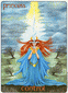 The prerequisite for inspired thought processes is unlimited freedom; creative thought accepts no boundaries. That is why the Prince raises his sword high to server the ties with the three figures pulling the chariot. These three represents restrictive ideas or emotions, or even confining relationships that could hinder the movement of the chariot. The crystal in the chariot has the shape of a double pyramid and shows the crystallizing of perception. The time is right to lend form and shape to new ideas.