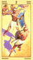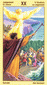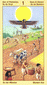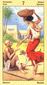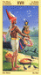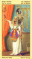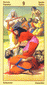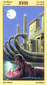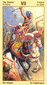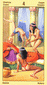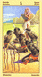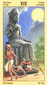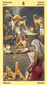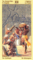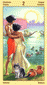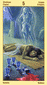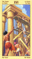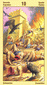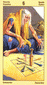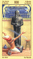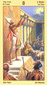 The phoenix heads turn away as if they wish to avoid each other. The card is general description of a state in which the creative energy and power of Leo are blocked (Saturn). The free-flowing energy has been greatly hemmed in a constricted. This pent-up energy is uselessly seeking an opportunity for expression. Life becomes a burden. The little wings underneath are still trying to lift the heavy lead wand.