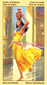 Fear has been overcome! The Princess of Wands, naked, open and unprotected, has conquered the Tiger of Fear (see "The Fool"). Her scepter bears the symbol of the sun. the feathers on her head signify enhanced perception and freedom, won by overcoming fear. She dances her powerfully ecstatic dance in a great surging flame. Next to her on the alter decorated with ram's heads, burns the fire spring the new beginning, to whose services the Princess has devoted herself.