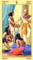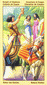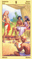 Fear of disappointment (Five of Cups) has been overcome. Body and senses have been cleansed and are ready for a happy meeting with a loved one. The lotus blossom unfold and radiate their brilliant yellow-orange color of revitalized life. The cups are of copper, the metal of internal healing. At closer inspection, one can see there is a snake in each cup. This can be understood as a sign of the transforming powers of naturally experienced sexuality. Overflowing emotions burst from the lotus into the cups, the bases of which are made of exotic, rare fruits. This card is an invitation to devote yourself to the richness of your own emotional frame of mind.