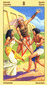 The planet Mars, bearer of dynamic action, finds itself in its own sign, Aries, the pioneer, who is always turning towards new ways and procedures. The increasing energy finds new direction. The wand are shown as two crossed daggers (Vajra), the Tibetan symbol for thunderbolts. The end of each bears a mask with a horse's head, symbol for temperament and the power to assert. The points of the arrows are adorned with snakes, demonstrating the renewal that goes hand in hand with destruction. Here is where renaissance takes place. Acceptance of opposites makes solutions possible, altering and expanding our perspectives.